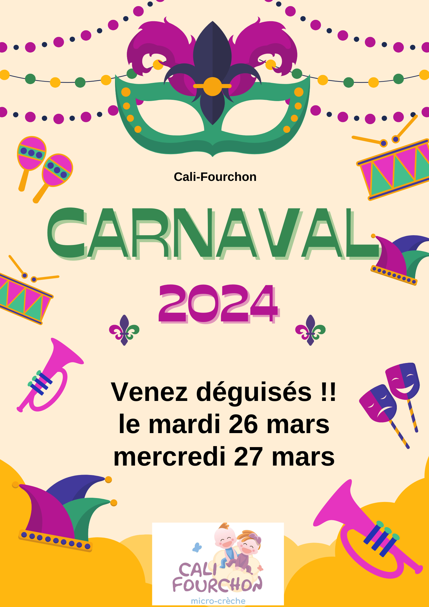 Demain, 26 mars et mercredi 27 mars, nous fêtons le carnaval au sein de la crèche !